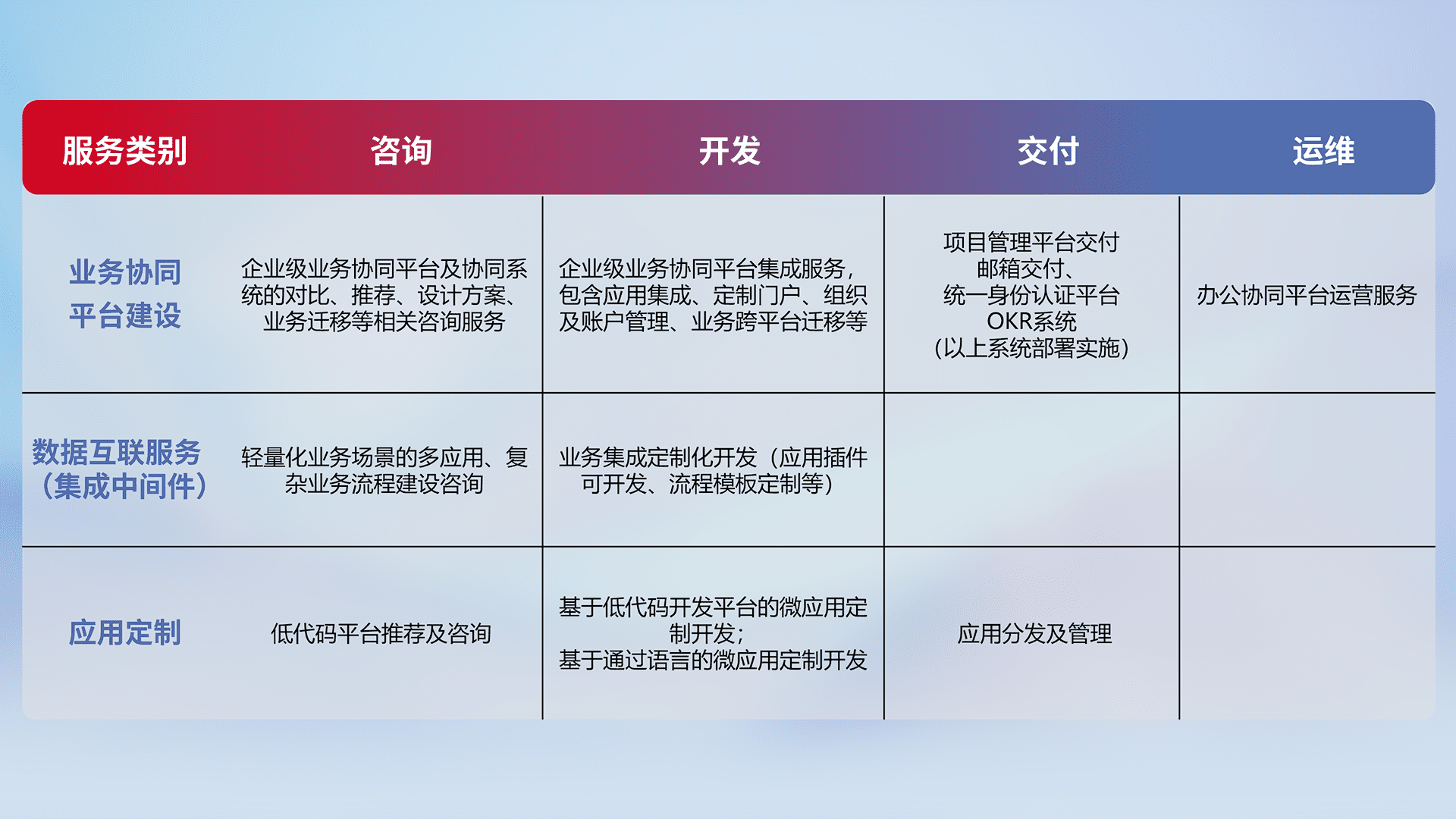 针对钉钉、、、企微、、、、IDaas等平台级产品提供产品的规划、、、方案、、交付、、定制化开发等服务,,实现如统一协同办公、、、智能客户服务、、混合会议管理、、智能数据查询、、、等业务场景,,,实现数字化转型。。