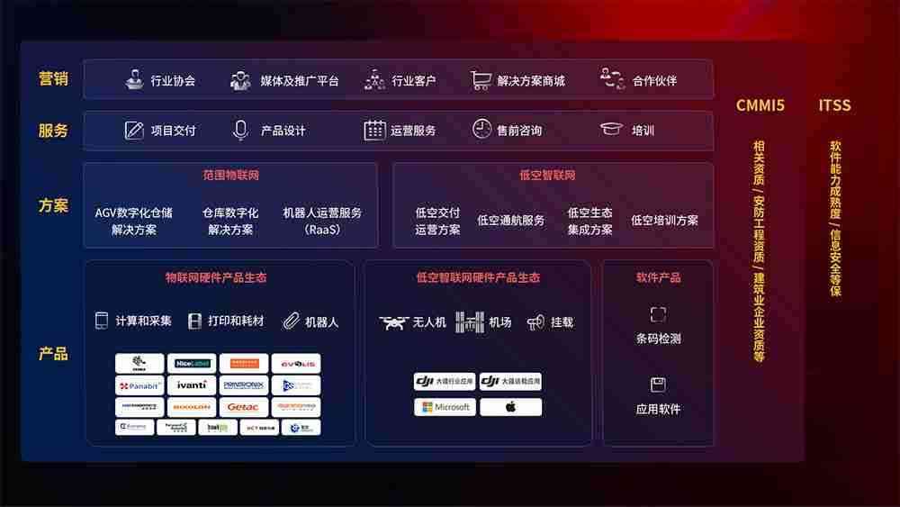 聚合国内外先进的物联网硬件产品品牌,,,,聚焦数字化仓储、、、机器人运营、、、低空智联网等领域,,,,共同打造适合客户业务场景的解决方案并提供交付服务